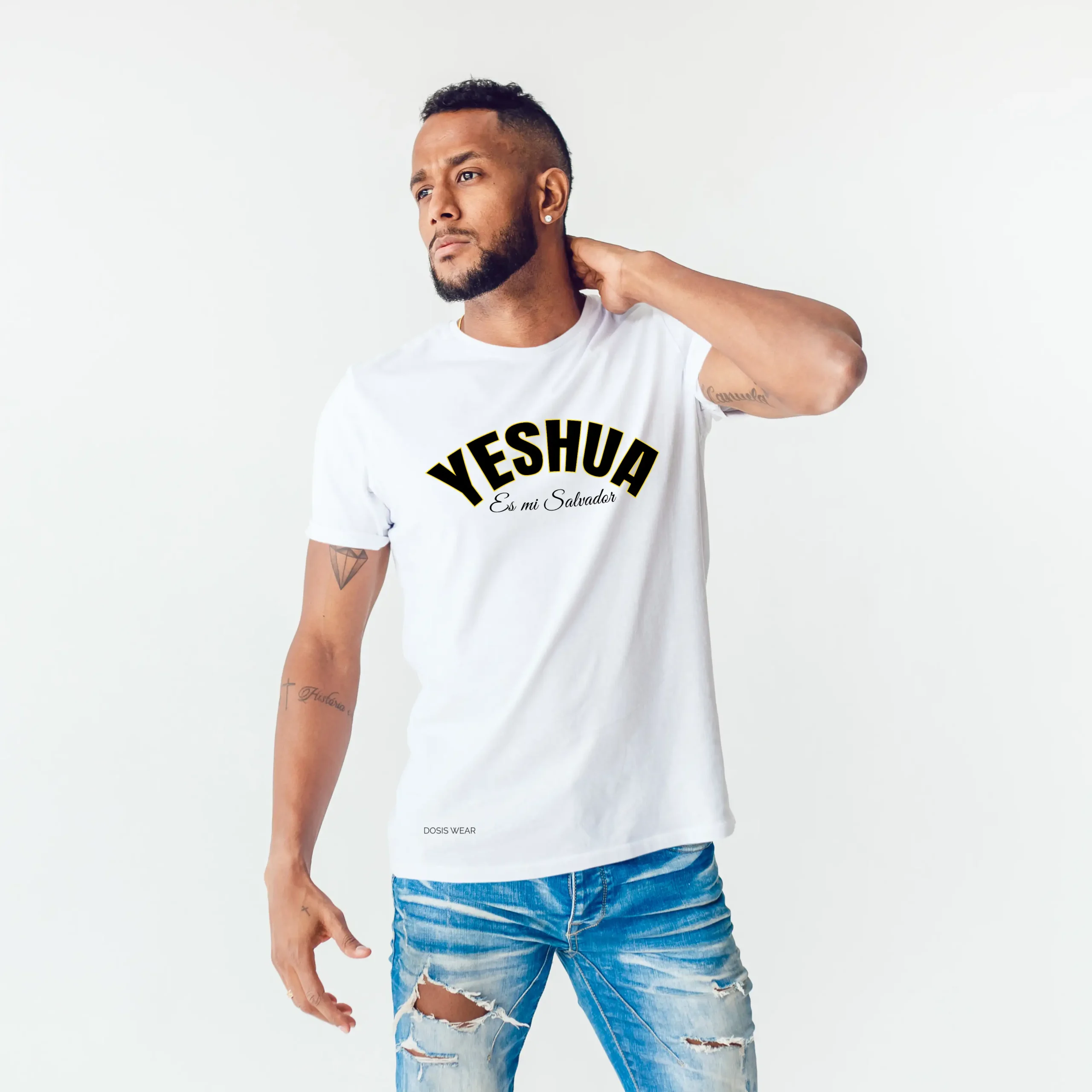 El cuello en rib mantiene su forma incluso después de múltiples lavadas, asegurando un acabado limpio y profesional. El diseño presenta la palabra YESHUA en un estilo destacado, acompañada de la frase Es mi Salvador, transmitiendo un mensaje poderoso sin perder elegancia.